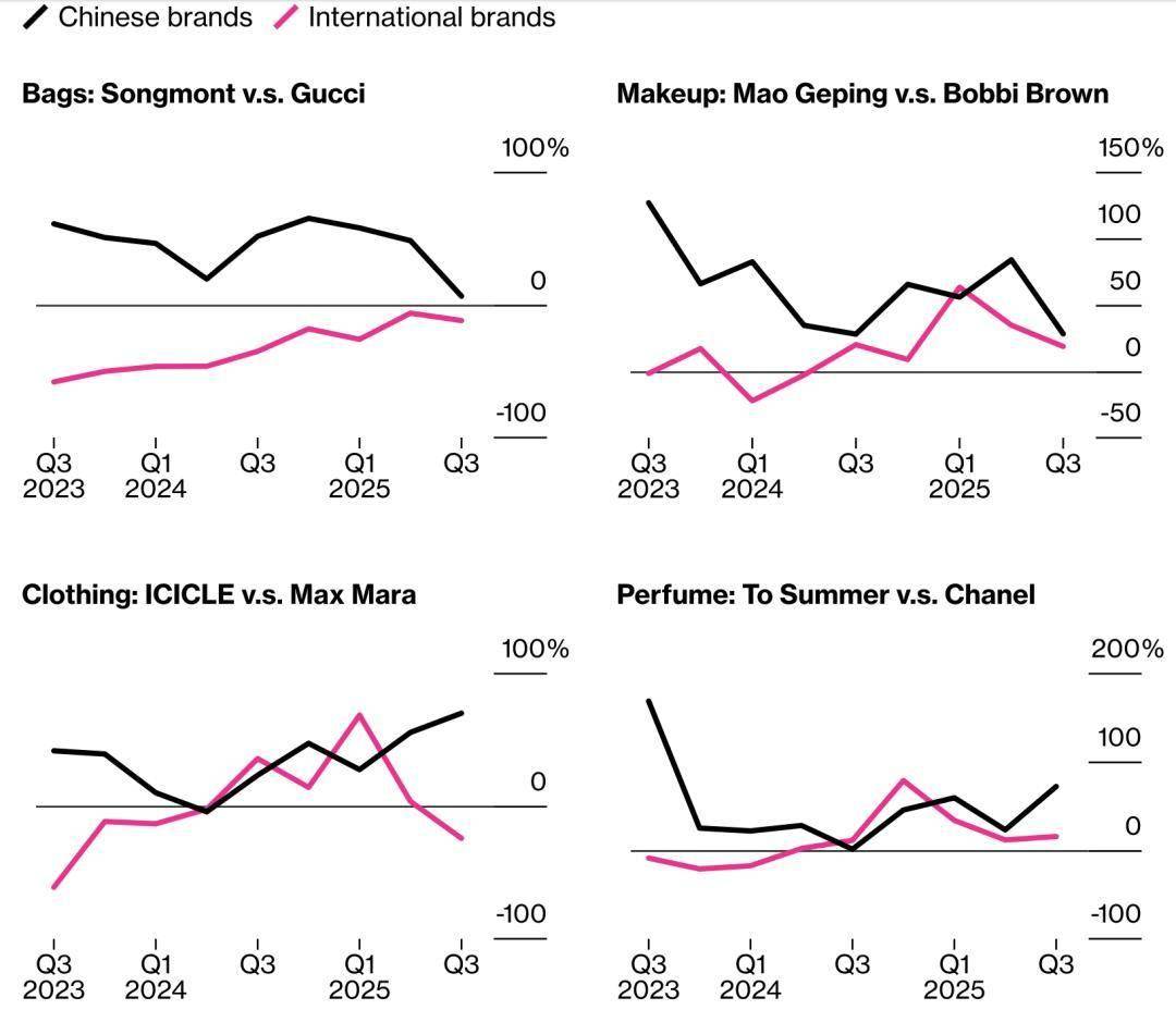 彭博在近期报道中指出,“中国490亿美元的奢侈品市场正在快速变化。”具体体现在:中国消费者对西方高端品牌的支出停滞不前,他们的大手笔消费正转向本土品牌,“这些品牌的崛起正重塑中国奢侈品市场格局,并迫使全球奢侈品巨头们密切关注。”——过去两年,五家极具代表性的中国品牌(山下有松、老铺黄金、毛戈平、观夏、之禾)的线上销售增长速度超过了海外的“高阶”品牌。